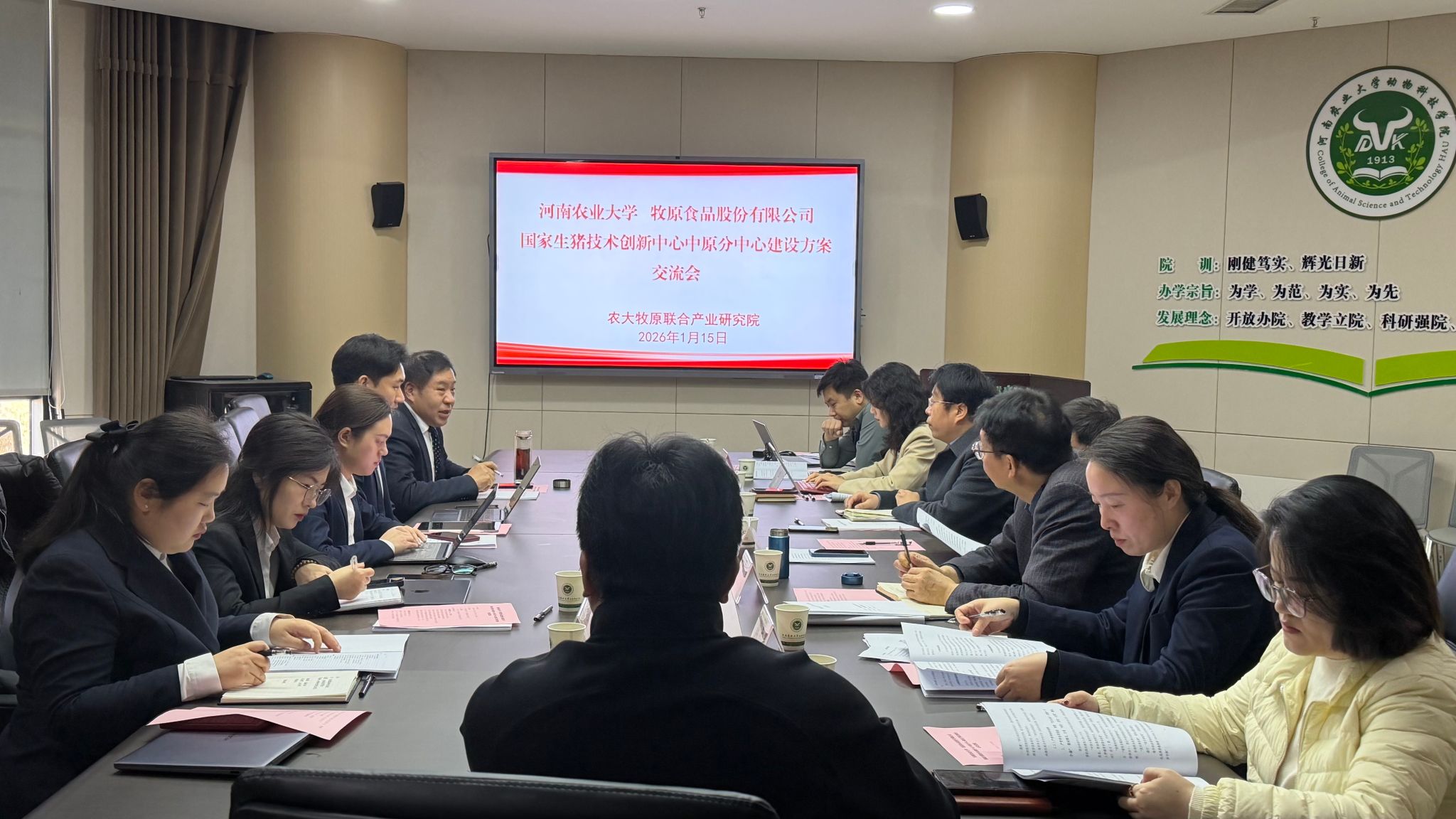 本网讯(通讯员 李秀领)1月15日上午,农大牧原联合产业研究院与牧原食品股份有限公司在龙子湖校区第一实验楼南501会议室召开国家生猪技术创新中心中原分中心建设方案交流会。牧原食品股份有限公司融资项目处负责人朱书玲、兽医诊断研发负责人李亚楠、董事长金融助理张永乾、国家生猪技术创新中心对接人谢杏双、融资部项目经理邵石英出席会议;牧原智能科技有限公司经理胡冬、政务部负责人张明川、种猪育种负责人朱红倩以线上形式参会。河南农业大学科技处副处长张世敏、动物医学院院长魏战勇、农大牧原联合产业研究院执行院长付彤、动物科技学院副院长蒋瑞瑞及生猪遗传改良与种质资源创新团队部分成员参加会议。会议由农大牧原联合产业研究院执行院长付彤主持。